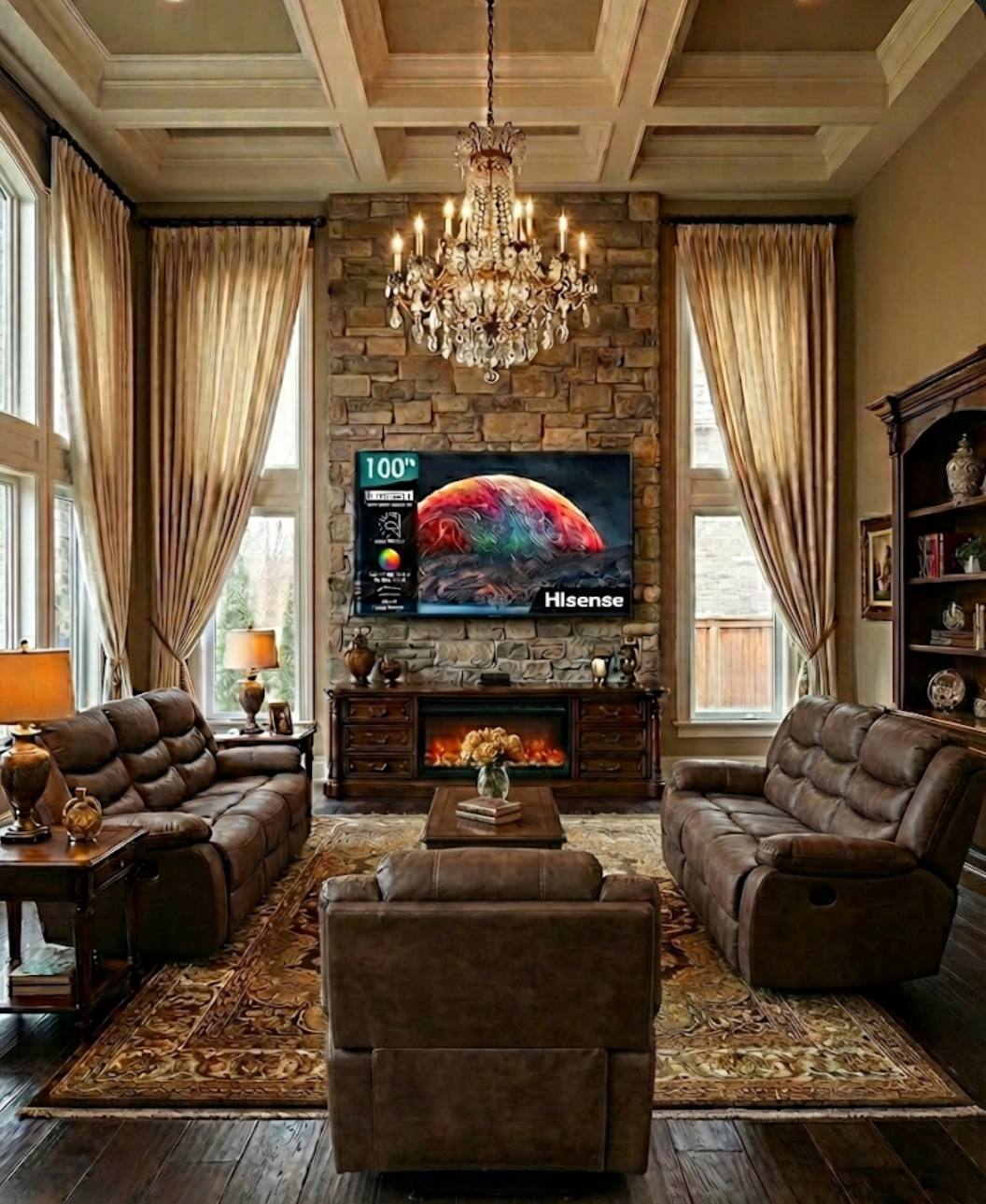 الشاشة كبيرة وواضحة، والكنب مريح جدًا، والمدفأة شكلها فخم بالمكان.