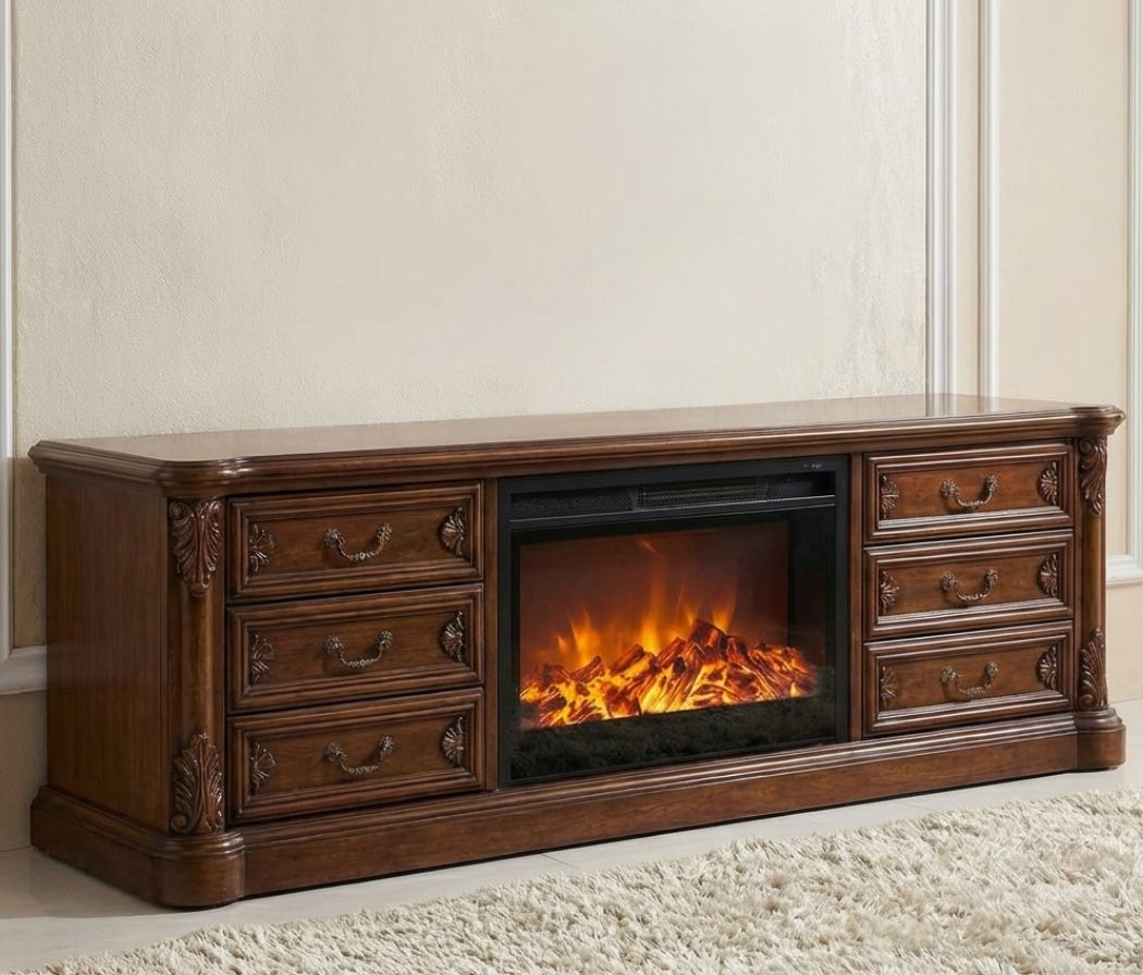 • وحدة المدفأة: شاشة LED بتأثير حطب مشتعل ولهب واقعي (يفضل ذكر ما إذا كانت للزينة فقط أو تحتوي على سخان حراري بناءً على المورد لديك).